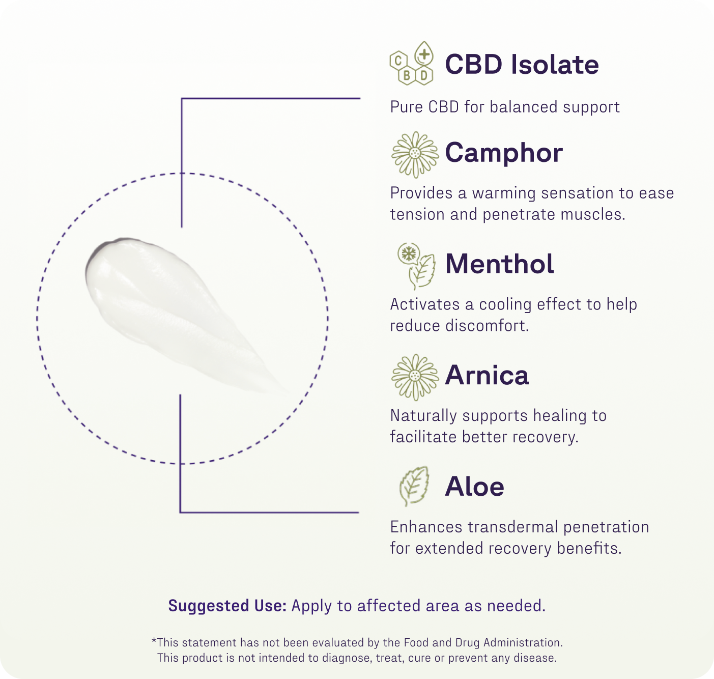 Aloe Barbadensis (Inner Fillet) Leaf Juice, Denatured Alcohol, Menthol, Glycerin, CBD (Cannabidoil), Camphor, Lavandula Angustifoila (Lavendar) Oil, Helianthus Annuus (Sunflower) Seed Oil, Arnica Montana Flower Extract, Cinnamonum Camphora (Camphor) Bark Oil, Xanthan Gum, Lecthin, Methyl Salicylate, Potassium Sorbate, Sodium Benzoate, Citric Acid.